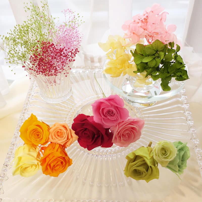 プリザーブドフラワーは 『保存ができるお花』 を意味しています。ドライフラワーにはない、柔らかな質感・美しい色合が人気の秘密です。元気なうちに摘み取った生花にオーガニック系の保存液や染料を吸わせて、鮮やかな色ときれいに咲いたままの状態での保存が出来るように加工されています。水やりの手間もなく生花の何十倍も美しさを保ち、2・3年もの期間楽しむことができる「魅力的なお花」です。