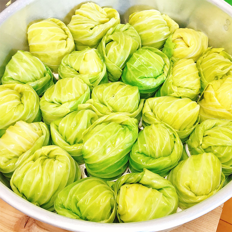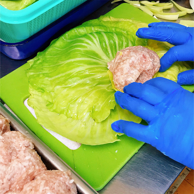 キャベツを一枚一枚丁寧にはがし、一つ一つ心を込めて巻いています。中身のお肉のつなぎには、パン粉ではなくご飯(袖ケ浦産米)を使用しています。
