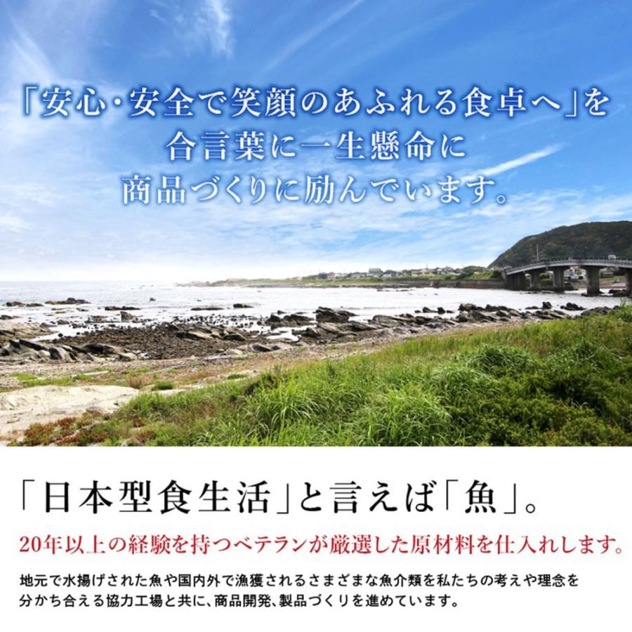 水産加工に携わり20年以上の経験を持つベテランが、長年の知識と勘を生かして原材料を厳選。理念を共有できる協力工場と共に、「安心・安全で笑顔のあふれる食卓へ」を合言葉に、一つひとつ丁寧な商品づくりに励んでいます。