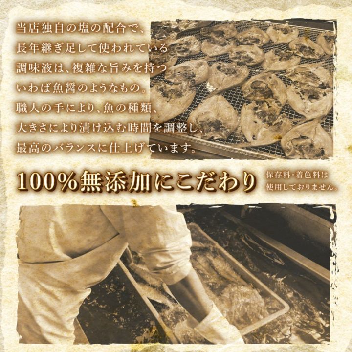自社工場で製造する干物は、保存料・着色料を使わない100%無添加。素材本来の旨みを大切にし、熟練の職人が手作業で丁寧に仕上げています。いつ食べても「旨い」と感じていただける商品づくりを心がけています。