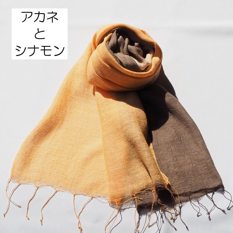 ジャーマンカモミールで鮮やかなバンダナが染め上がりました。アースカラーの服の差し色にぴったりです。